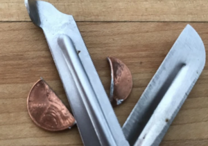 MyMedic claims their scissors can cut through a penny. So we put them to the test! While we don’t advocate doing this, it sufficiently demonstrates how robust their scissors are (and how easily they could cut through a seatbelt in a car emergency). Image credit: Ryan Huetter